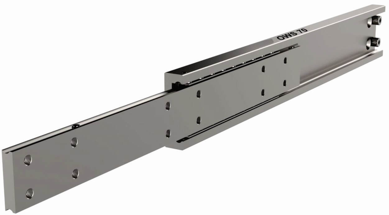 本款導軌行程50%, 載重能力310-1060kg/對, 導軌在550mm長可以延展275mm, 載重達到960kg。由兩節(jié)冷抽鋼制成, 珠軌經(jīng)過精密加工,OWS-70導軌在閉合靜置的情況下有相當好的抗震抗沖擊性能,因此適合安裝于車載環(huán)境應用。導軌在展開時也能夠提供強大的剛性,使其成為支撐動態(tài)負載應用和手動抽拉裝置的絕佳選擇。