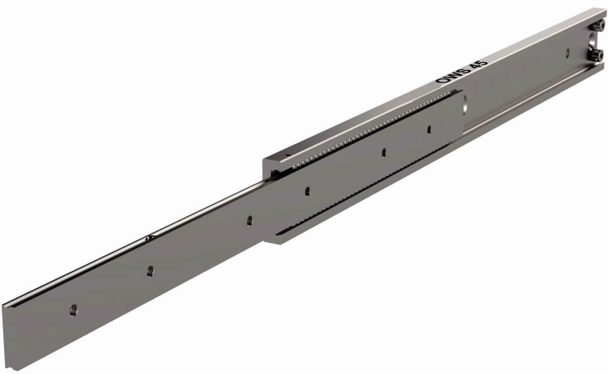 本款導(dǎo)軌行程50%, 載重能力80-270kg/對, 導(dǎo)軌在550mm長可以延展275mm, 載重達(dá)到270kg。由兩節(jié)冷抽鋼制成, 珠軌經(jīng)過精密加工,OWS-45導(dǎo)軌在閉合靜置的情況下有相當(dāng)好的抗震抗沖擊性能,因此適合安裝于車載環(huán)境應(yīng)用。導(dǎo)軌在展開時也能夠提供強(qiáng)大的剛性,使其成為支撐動態(tài)負(fù)載應(yīng)用和手動抽拉裝置的絕佳選擇。