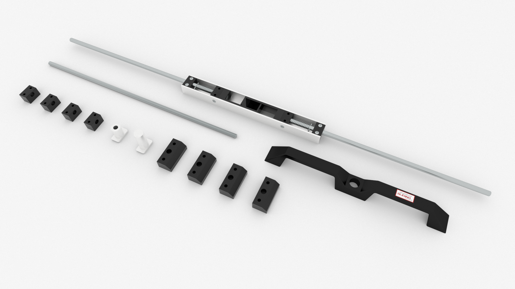 鎖進&鎖出版本的把手鎖系統(tǒng)是將鎖件機構(gòu)安裝于抽屜尾端, 并新增零件(包括: 1000mm長鍍鋅M10螺桿, 尾端按鈕, 引導(dǎo)塊和檔塊)。所有零件缺一不可才能成為一個完整的系統(tǒng)。