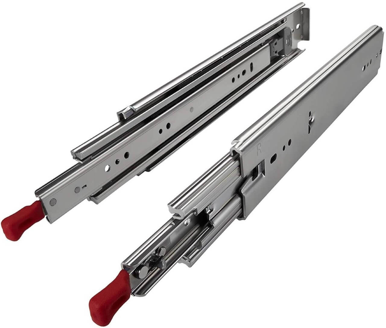 滑軌的安裝孔位, 長(zhǎng)度及載重皆標(biāo)注在型錄中?;壉砻驽冧\, 內(nèi)部結(jié)構(gòu)建置有緩沖檔塊。鋼珠材質(zhì)為不銹鋼, 把手材質(zhì)為鋅合金套上高能見(jiàn)度的紅色尼龍。顯示尺寸皆為滑軌本體, 若需計(jì)算包含把手的滑軌總長(zhǎng), 需加上32mm把手長(zhǎng)。